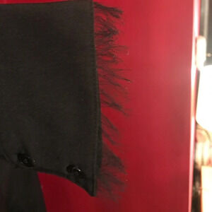 Linen like black fringe jacket. 67% Polyester, 30% Rayon, and 3% Spandex