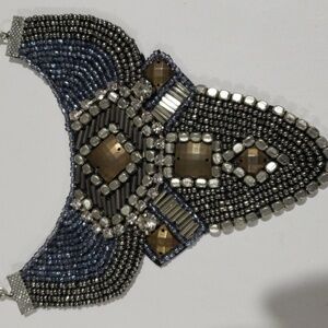 Elevate your style with this vintage-inspired mosaic statement necklace. This bold piece adds elegance and charm to any outfit, featuring intricate beadwork, geometric patterns, and multi-tone metallic accents. Perfect for formal events or chic everyday wear.