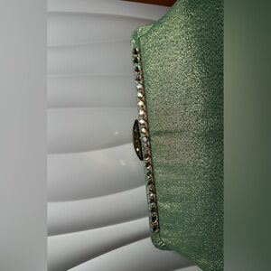 Add a touch of sparkle to your ensemble with this shimmering green clutch. Perfect for evening events, this stylish accessory complements any outfit. Green metallic fabric outside with iridescent, green rhinestones and satin fabric inside. This is from the 1960s and doesn’t even look like it’s been used. Has the original wax paper inside. She is beautiful. This would be great for the holidays or New Year’s Eve parties, etc..