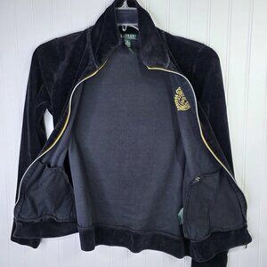 Ralph Lauren Sweater Jacket Womens Small Black Velour Full Zip Crest Logo Preppy