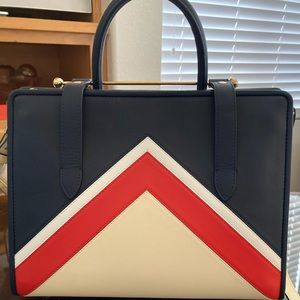 Elegant Strathberry tote with bold chevron design. Features navy, red, and white colors. Includes top handle and shoulder strap.