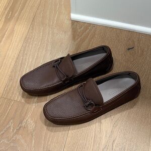 Brand new. Never worn. Elegant dark brown leather slip-ons. Features a textured finish and classic design. Ideal for versatile wear.