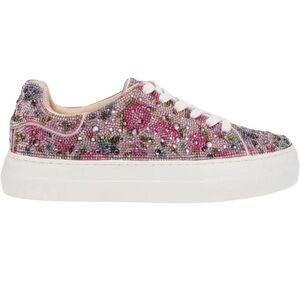 Betsey Johnson Sidny low-top sneakers featuring an allover rhinestone floral design. These statement sneakers are fully embellished with multicolor crystals on a pink base and finished with a chunky white platform sole for added comfort and style.