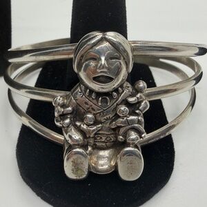 The bracelet weighs 30 grams and has an internal circumference of 6.5 inches including the 1-inch gap. It is stamped sterling along with the bottom of the maker's hallmark, which could not fit on the stamped surface.