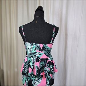 Vibrant bikini set with tropical leaf print. Features pink and green colors.
