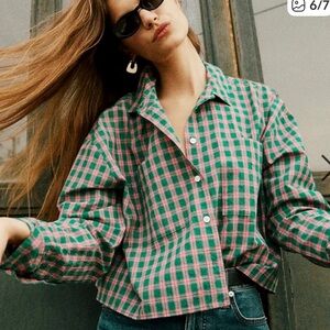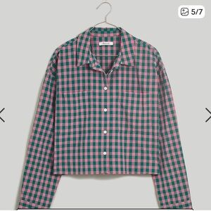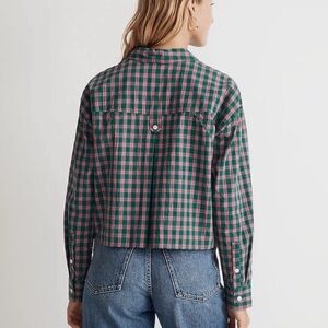 Madewell The Signature Poplin Crop Shirt in Plaid Stylish plaid button-down shirt. Features green and pink check pattern. Perfect for casual wear.