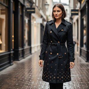 ***SOLD***This striking Michael Kors trench coat combines modern sophistication and timeless elegance. Adorned with gold studs and buttons, it exudes luxury and style. The belted waist accentuates the silhouette, while the black polyester-nylon blend ensures lightweight durability. Designed for medium-sized wearers, it's perfect for elevating any wardrobe with its impeccable detailing.