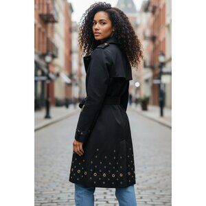 Michael Kors coat, black trench coat, gold studded coat, medium trench coat, belted trench coat, luxury outerwear, designer trench coat, gold accents coat, polyester coat, nylon coat, medium size coat, stylish coat, black and gold coat
