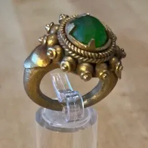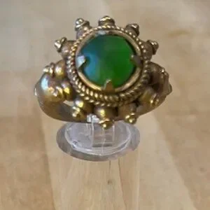 Magnificent old ring with a sunburst design and a green cabochon stone, from Central Asia. Intricate double rope-pattern border around the translucent stone. Size is about 8.5. Weight is 0.7 ounces. Probably from Afghanistan.