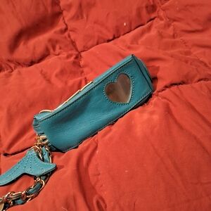 Unique fish-shaped clutch. Features blue body with cream accents. Gold zipper and stud details. Perfect for a playful touch.