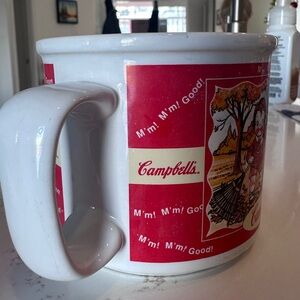 Vintage Campbells soup mug In Good Used Condition - some wear on the red portion see pictures No chips Features kids playing scenes - fall and winter From 1998 Classic Old school Vintage Grandma Cottage core Cozy