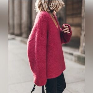 Elevate your wardrobe with this elegant fuchsia V-neck sweater. Perfect for adding a pop of color to your outfit. Oversized, very soft. Never worn.