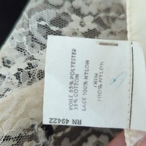 from the 70's. Polyester/ cotton blend ivory semi sheer fabric . This was mine from the 70's and rarely worn. Unfortunately, when washed the yoke lace split in several spots. I have provided photos. I believe this can be hand stitched together as it happened on the lines of the lace. the first photo shows 2 holes on the back and the second shows one on the front right. The line on the sleeve isn't a pull. It's just part of the fabric and has always been there. with the exception of the lace on the yoke, the rest of the top is in great condition. Vintage size 9. 18 inches pit to pit and 23 inches down center back. Smoke free home