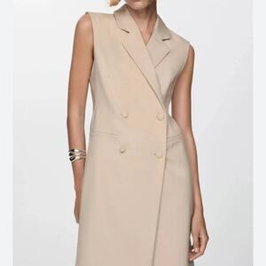 This double-breasted blazer dress is a timeless statement piece, blending the sharp tailoring of a blazer with the structured elegance of a trench coat. The vibrant green color, sleeveless cut, and clean lines create a modern yet classic silhouette that transitions seamlessly from work to evening wear.