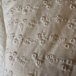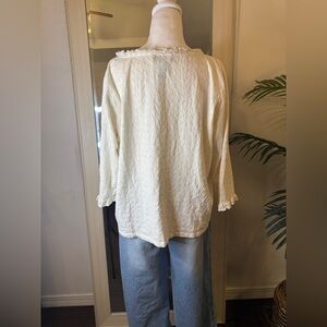 A Ralph Lauren rich cream floral textured top. Great piece to add to a pair of jeans or slacks. Cute ribbon collar accents.