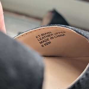 Elegant black heels by Ellen Tracy featuring stylish straps and a sleek design. Suede black leather upper. Uppers are in great condition. There is a small imperfection at the top of the left heel, per the photos. Manufacturer defect? Soles are in like new condition. Defect is hardly noticeable. Perfect for any occasion. Clean, smoke free home.