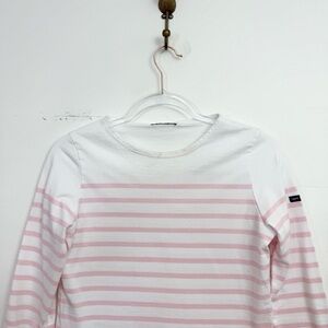 DESCRIPTION: Saint James Pink & White Breton Stripe Long Sleeve Top Size XS. Classic French style from Saint James. Timeless Breton stripe long sleeve top in soft white with pale pink stripes. Features a crew neckline, straight silhouette, and signature Saint James sleeve logo tab. Made from 100% cotton for breathable, everyday wear. Perfect layered or worn on its own for a polished, effortless look.