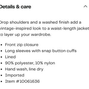 The jacket has long sleeves with dropped shoulders and snap button cuffs. There are two front pockets with snap closures and an elasticized hem.