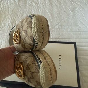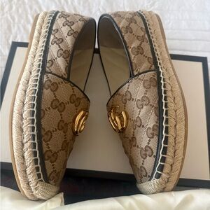 Elegant Gucci espadrilles in brown with signature gold logo. Perfect for casual elegance. With dust bag and box. Slight wear. With original dust bag and box.