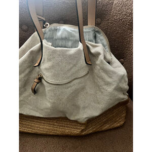 This unbranded tote bag features a two-tone design with a beige canvas upper and a woven tan straw base. It has tan faux leather shoulder straps and a top zipper closure. The front displays "going places!" in black script, complemented by a tan tassel charm. The interior is lined with a light blue patterned fabric, offering one zip pocket, two slip pockets, and a key clip. An exterior side zip pocket provides additional storage. The bag is new without tags.