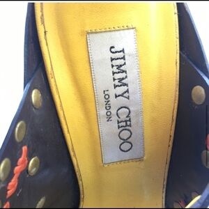 It’s from Jimmy Choo’s 2009 Spring Summer Collection. Studded & Whipstitch Accents, Stiletto Heels with Platform, Wrap-Around Straps & Buckle Closure at Sides. Heels 5.25”