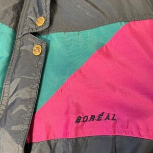 Bold and iconic vintage winter coat from Boréal, straight from the 1990s. This statement piece features a striking colorblock design in navy blue, mauve, fuchsia, and turquoise—perfect for lovers of true retro outerwear.