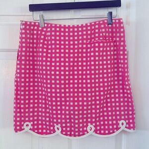 Chic and stylish pink gingham skirt with scalloped hem. Perfect for casual outings or a day on the golf course.