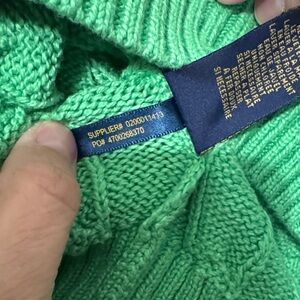 Vibrant green crewneck with cable knit design. Iconic Polo logo on chest.