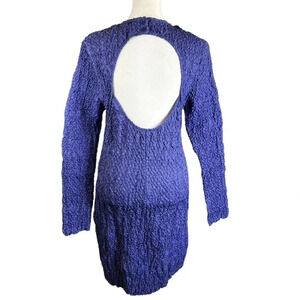 Softly textured mini dress in a dreamy periwinkle blue. Designed with a flattering shapely fit, lightweight crinkle stretch fabric, long sleeves, and a keyhole back. Easy, elegant, and made to move from dinner to drinks.