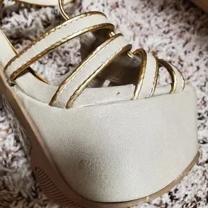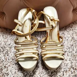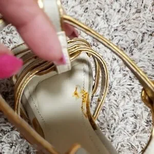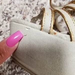 There is some wear to these heels, see pics closely. There's glue residue on them, but can't be seen when worn. Gold highlights and taupe colored shoe. Adjustable ankle strap. Still in good condition.