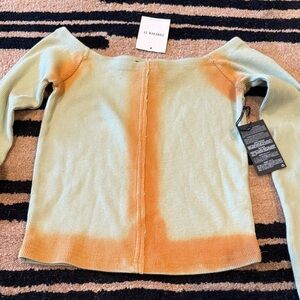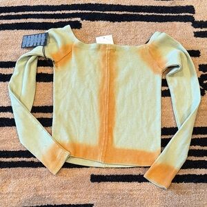 Stylish off-shoulder top. Features green and orange tie-dye design. Long sleeves. Perfect for casual wear.