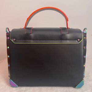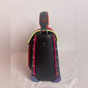 Chic black satchel with vibrant rainbow and multicolor chrome details. Features a sturdy handle and adjustable strap. Ideal for a bold fashion statement.
