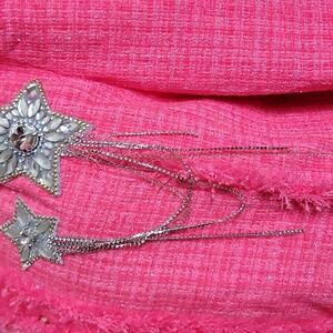 This stylish pink jacket features charming star embellishments in silver with gold trim and a fringed design. Perfect for adding a pop of color to any outfit. The buttons are snap and metal 100% lined there's just a little bit of padding at the shoulder for structure it's a heavy jacket very well made It says 2XL I wear an extra large and it fit me so I would say xl and up.