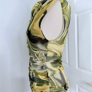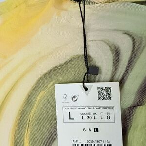 Zara Green Printed Tulle asymmetrical sleeve top, ruched , lightweight stretchy soft comfortable fabric , new with tags size large