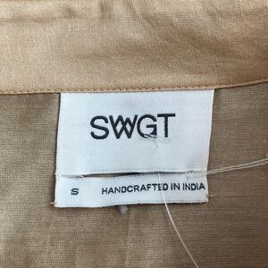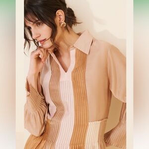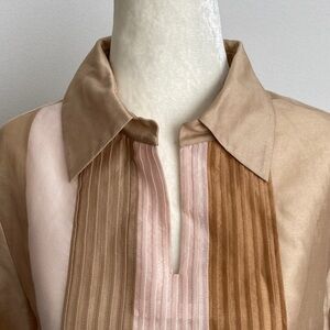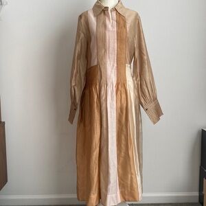 Brings a contemporary perspective to traditional Indian craftsmanship. This is not lined - may need a slip because it’s sheer. Rent styles in nature-inspired silhouettes + colors. Midi shirtdress in striped pattern and pleated fabrication. Pullover styling. Cotton and silk. Neutral colors. Comes from a pet/smoke free home.