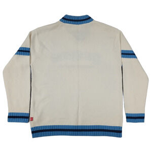 JNCO Jeans, mens, medium, knit sweater, pullover, cream, blue, navy, vintage, 90s, Y2K, streetwear, collegiate, v-neck, embroidered, acrylic, retro, RN 102799