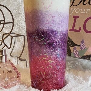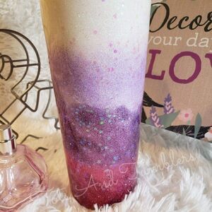 Need to brighten up your work day? Are two of your favorite colors purple and pink? Then this is tumbler for you. It is a beautiful blend of pink, purple, lavender and white topped with a chunky glitter and sealed with an epoxy resin to keep all the brightness long lasting. This 22oz Slim HOGG tumbler comes with a straw. It is also double-walled, vacuum insulated, and BPA free. The price of this cup is $40. There is currently no monogramming on it; but, it can be added at time of purchase.