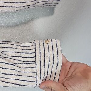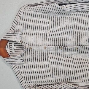 Casual button-down with classic black and white stripes. Ideal for versatile styling.