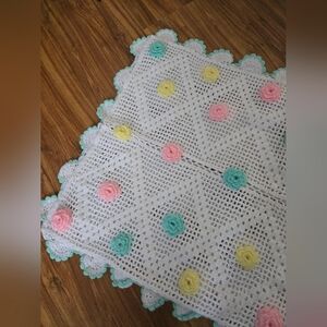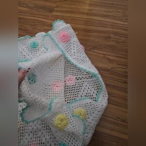 Beautiful vintage hand-crocheted pillow sham featuring delicate pastel rosette florals in soft pink, butter yellow, and robin’s egg blue. Crafted in an airy open-weave crochet with a scalloped edge trimmed in pale aqua, this piece has a charming heirloom cottage feel.