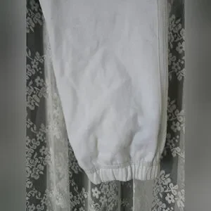 Vintage Y2K Aerie cropped sweatpants in a classic white colorway with large vertical AERIE logo detail on the leg. Soft, cozy fleece interior that looks barely worn—like new on the inside. Relaxed jogger fit with elastic waistband and adjustable drawstring, finished with elastic cuffs for that early-2000s lounge aesthetic.