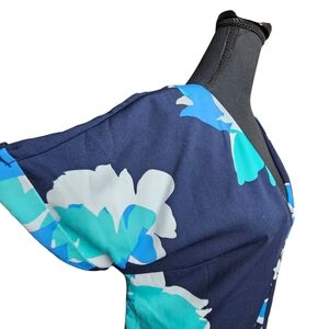 Elegant dress with floral pattern. Features blue and white hues. Ideal for casual wear or work.