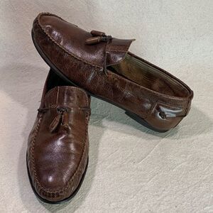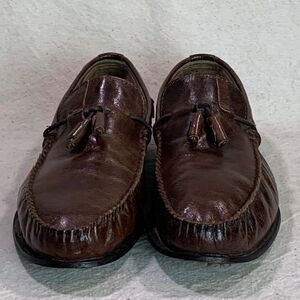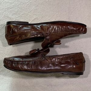 Previously worn; made in Portugal; leather uppers; tassels; unlined; leather insoles; leather outsoles; leather heels with rubber heel guards. Shoes are in good condition; there is slight variations in shade of brown; soles and heels are in great shape. #aldo #bootandshoetraders
