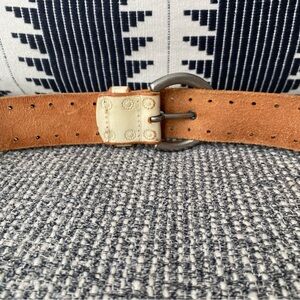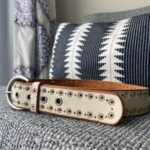 Fossil women's cream-colored studded leather belt with antique silver-tone hardware and embossed detail. Western style. 100% leather size Medium