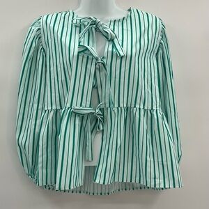 This adorable Y2K-inspired peplum babydoll top is perfect for adding a touch of playful style to any outfit. Featuring puff short sleeves, three functional bow ties on the front, and a cute flap detail, this top is as charming as it is versatile. The ¾ length balloon sleeves and elastic cuff add extra flair, while the relaxed fit keeps you comfortable and cute all day long.