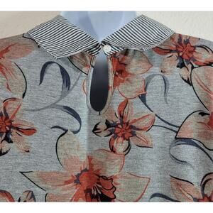 gray, floral, stripe, pointed collard, lightweight, layered look, stretchy, soft, vented sides, keyhole on back