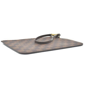 This is the authentic LOUIS VUITTON Damier Ebene Neverfull MM GM Pochette. This stylish wristlet is crafted with the signature Louis Vuitton Damier coated canvas. The pouch features a brown leather wristlet and gold hardware. The polished gold top zipper opens to a red-striped fabric interior with a patch pocket.