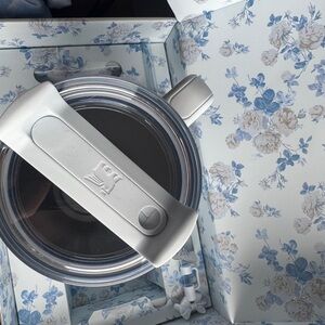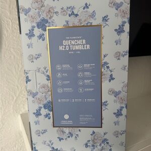 Stylish tumbler with a handle. Features blue and cream floral design. Everblooming Rosettes