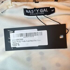 Nasty Gal Spotty Plunge Ruffle Front Maxi Tea Dress in cream and black polka dot and a hit of gold metallic thread throughout the fabric