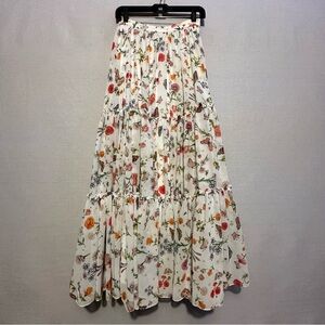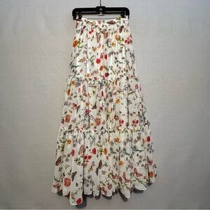 NWT Ieena for Mac Duggal Tiered Chiffon Maxi Skirt in white multicolor. Pattern has flowers, butterflies, stars, and dragonflies throughout. A perfect garden party skirt! Has some heft to it. Fully lined. Center back zipper with hook & eye closure. Style # R55493. Size 2.