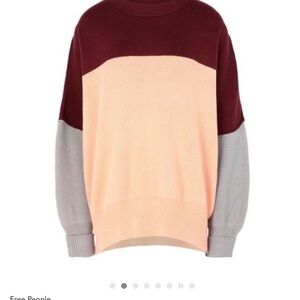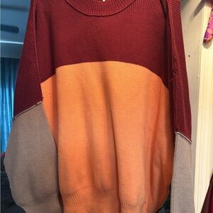 Chic and cozy multicolor sweater. Features burgundy, peach, and gray blocks. Perfect for casual wear.